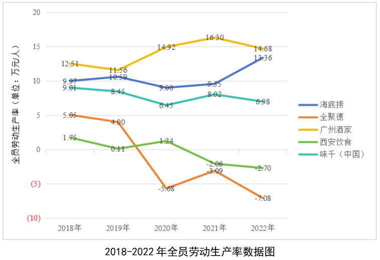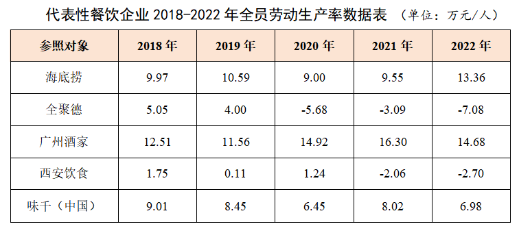 根据上市公司公开年报,传统餐饮公司、特色火锅店、快餐店等部分有代表性餐饮企业近五年的劳动生产率作为参考依据,指标情况如下: