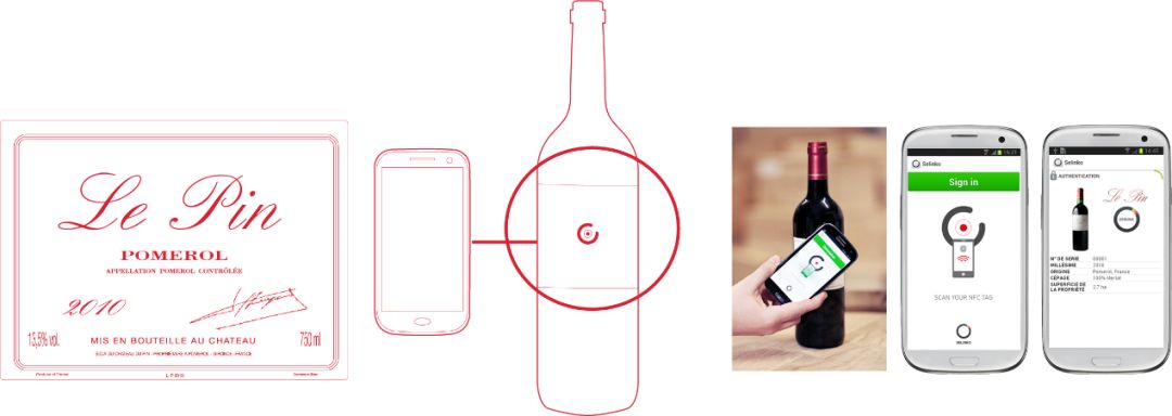 酒庄将加密的数字证书写入Selinko公司研发的芯片中并将其植入酒标,只需用一部带有NFC功能的智能手机进行扫描,即可鉴定酒款真伪并获取相关信息(比如品种、产区、年份等)。