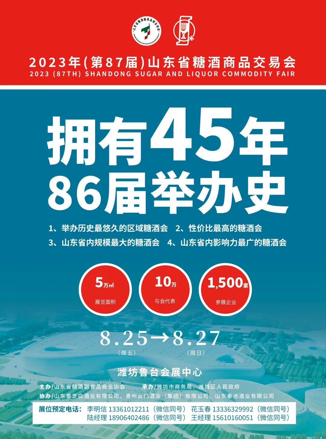 2023年(第86届)山东省糖酒商品交易会参展企业将达1200余家,参展范围涵盖酒类、食品、饮料、乳品、调味品、灌装、包装、日化等10多个行业,参展品种近20000个,参展企业范围除我省广大工商企业外,还有贵州、四川、山西、江苏、北京、河南、河北、安徽、上海、福建、广东、新疆等20多个外省市的企业。作为历史最悠久、性价比最高的区域糖酒会,将成为中秋、国庆旺季市场广大客商的有效对接平台,为广大工商企业提供无限商机。