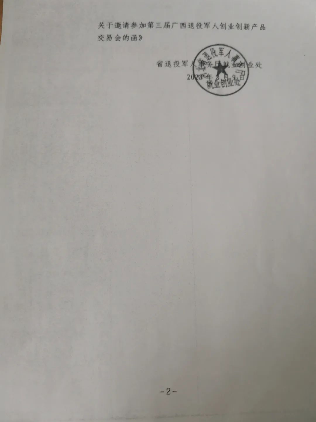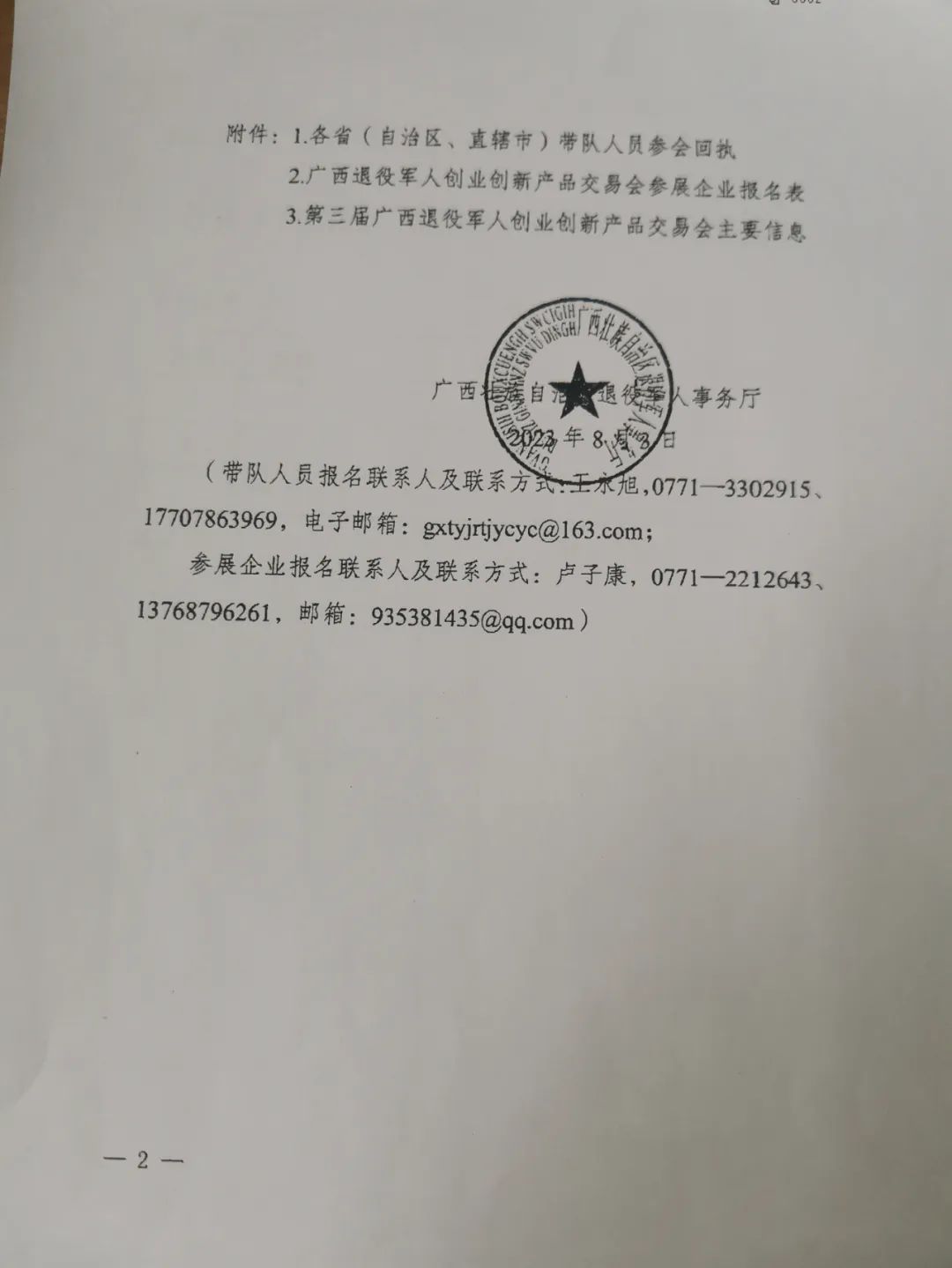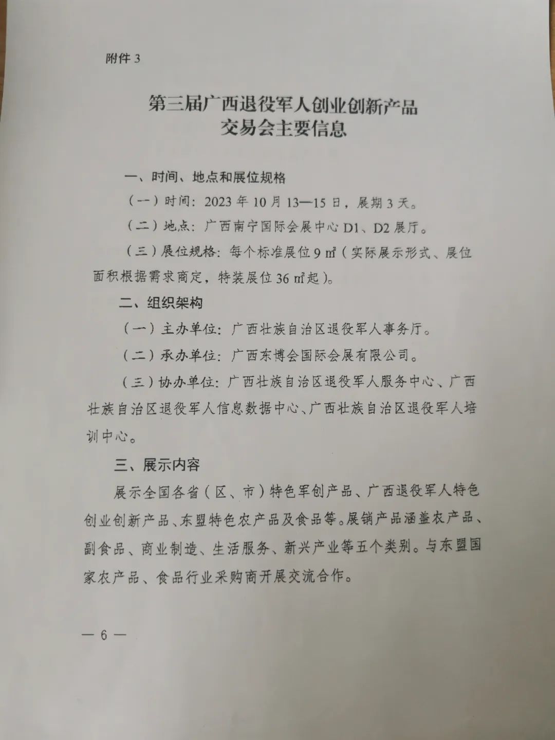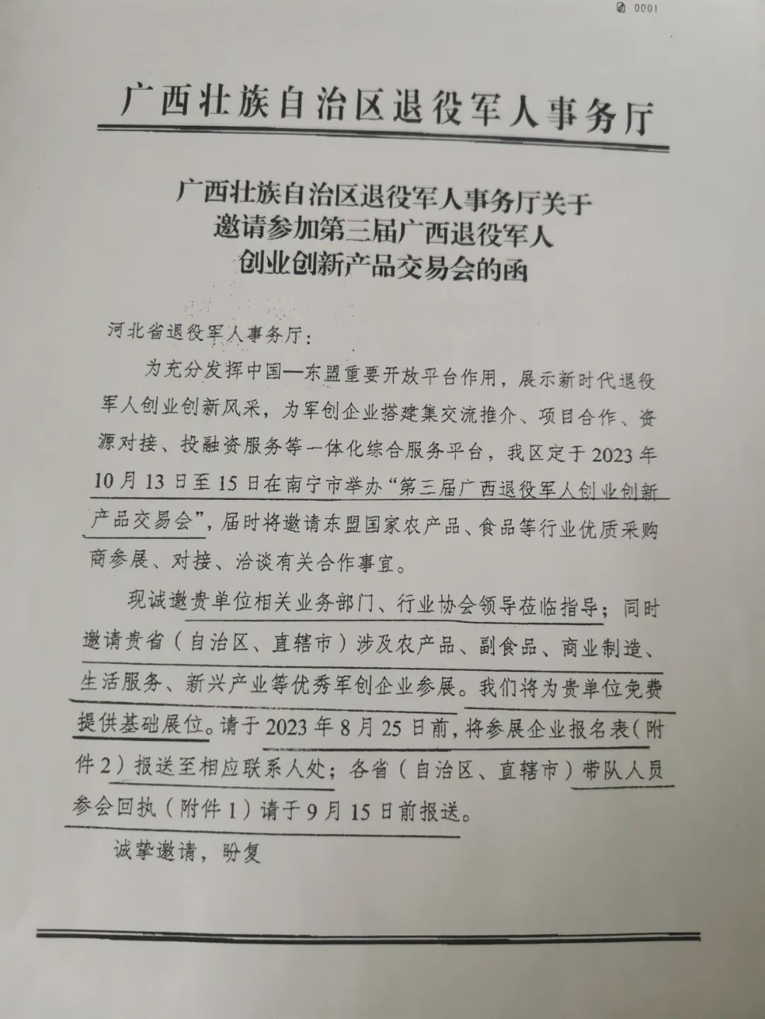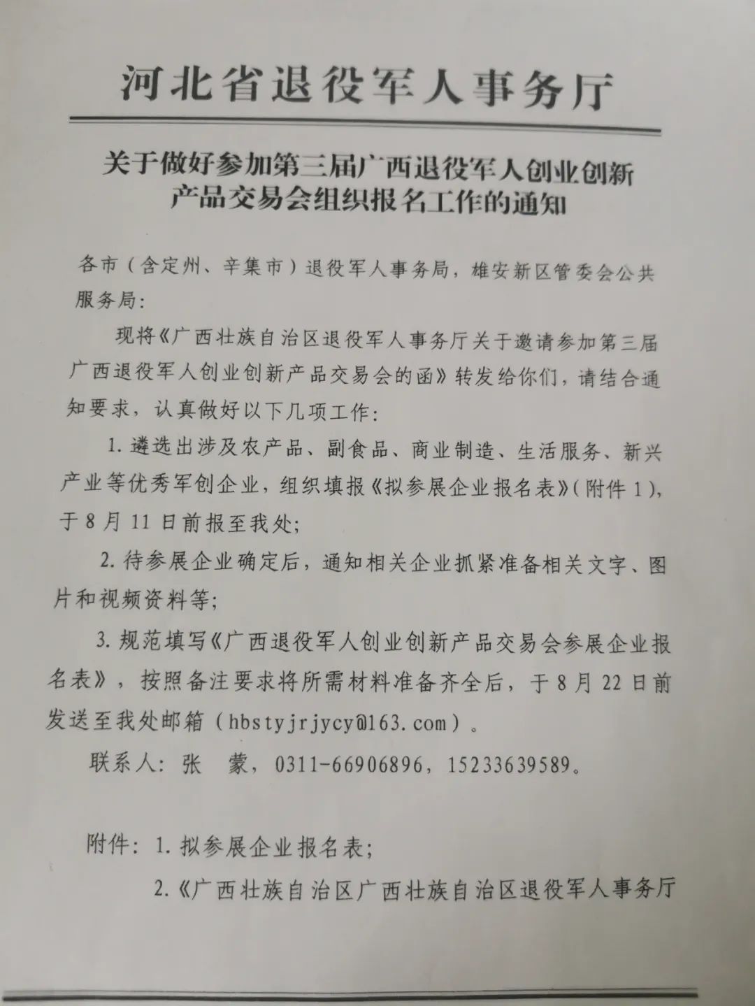 第三届广西退役军人创业创新产品交易会将于2023年10月13日至15日在南宁市举办,诚邀我区涉及农产品、副食品、商业制造、生活服务、新兴产业等优秀军创企业参展,广西壮族自治区退役军人事务厅将免费提供基础展位。有意参加者请于2023年8月14日前联系清苑区退役军人事务局安置股。联系电话为:0312-7950157。