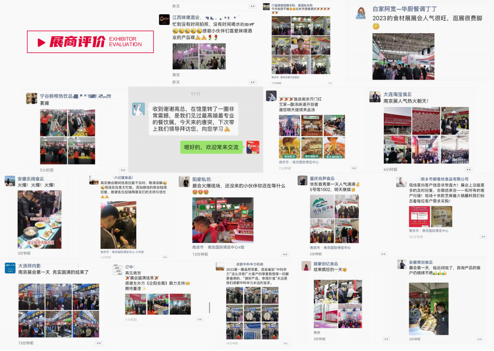 预制菜:预制调理食材、冷冻面点、速食食品、预制菜品、半成品、即食食品、各类荤素调理包等肉禽及肉禽调理品:牛羊肉类、猪肉类、禽肉类、肉卷、肉丸、火腿、调理食品及即食产品等调味品:火锅底料、汤料、蘸料、食用油、鸡精、酱油、醋、调味酱、豆瓣酱、复合调味料、食品添加剂等冷冻冷藏食品:素食米饭、速食汤、素食快餐、方便粥、调理包等冷冻速食食品等蔬果净菜:有机蔬菜、速冻蔬菜、调理菜、酱菜、泡菜、蔬菜制品、食用菌及各种净菜产品等水产海鲜:鱼类、贝类、虾类、海鲜、高端滋补食材及调理品等餐厨用品:餐饮家具、外卖包装袋、包装盒、餐厨器皿、火锅桌椅、收银终端、送餐机器人、炒菜机器人、服饰工装、餐饮装修设计等食品生产加工机械:中央厨房设备、肉禽类加工机械、包装机械、仓储及冷链物流设备、包装材料、检测设备、制冷设备、净菜设备等上届展会于2023年3月16-18日在南京国际博览中心(4、5、6、7号馆)举办,四大展馆总展出面积60200㎡,全国各地来展专业观众突破10万+达到106124人次;展出品牌2000+。据不完全统计,预估展会期间实现交易额及意向订单约8.7亿元。现场同期举办:2023华东酒店预制菜邀请赛,2023华东地区酒店餐饮业参观采购团欢迎晚宴,2023江苏省烹饪协会名厨专业委员会颁奖典礼,打响振兴餐饮行业第一枪,极其火爆的展会现场为餐饮行业的稳步复苏注入强力信心。现据统计复展率高达80%。