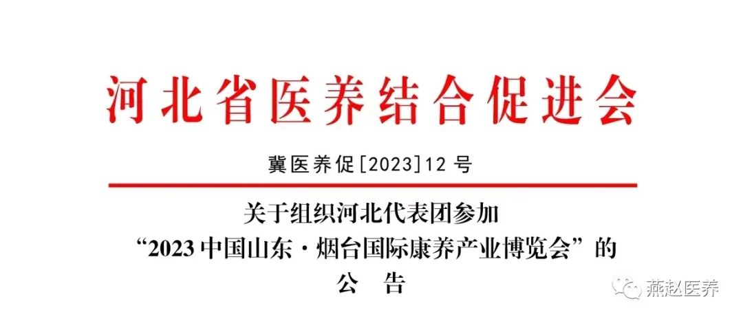在河北省卫生健康委员会指导下,河北省医养结合促进会拟组织全省医养结合相关单位参加“2023中国山东·烟台国际康养产业博览会”。