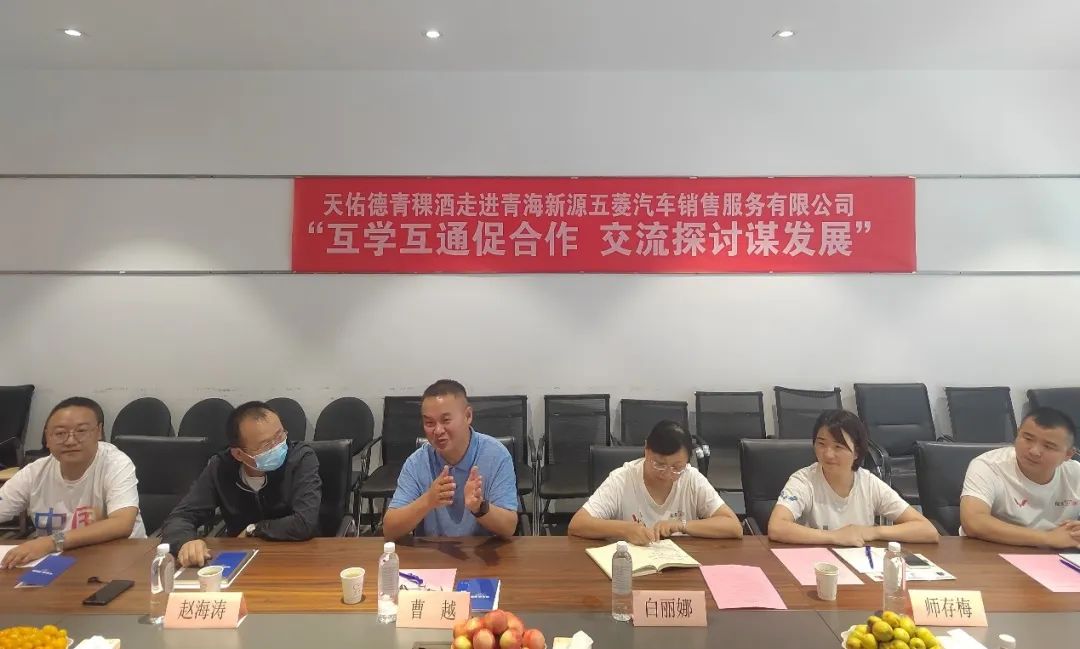 2023年8月10日下午,天佑德青稞酒公司营销中心团购部总经理孙永吉、营销中心行政部部长赵国维、营销中心高端酒业务部部长孙延奎携手营销中心团购部经理胡发杰、营销中心团购部业务经理冯天平等一行前往青海新源五菱汽车销售服务有限公司,以“互学互通促党建,交流探讨谋发展”为主题开展交流活动。