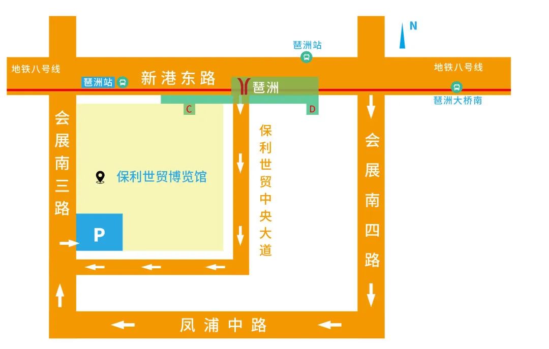 >>> 地铁:可乘2号线(广州南站方向)至昌岗站下车,换乘8号线(万胜围方向) 到琶洲站C出口下,步行至广州保利世贸博览馆;约39分钟。