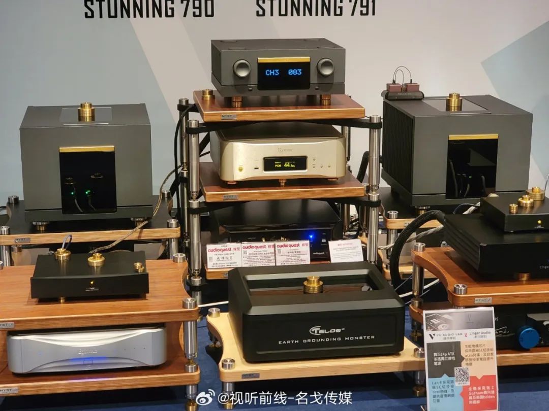 亚柏高演示KINKI STUDIO旗舰STUNNING 790前级和791单声道后级搭配Triangle的MAGELLAN CELLO 40th落地音箱,还有Telos地盒等。