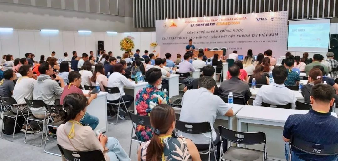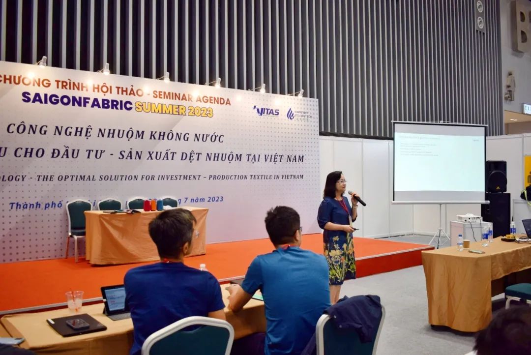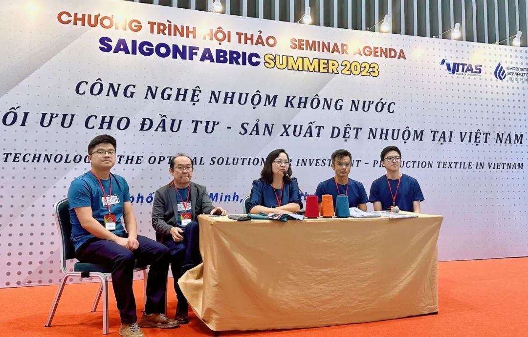 7月26日,越南西贡面辅料及制衣配件展览会在胡志明市西贡会展中心拉开序幕。据了解,此次展会是由越南工贸部、越南纺织服装协会(VITAS)、越南纺织服装集团(Vinatex)和胡志明市服装、纺织品、刺绣和针织协会(AGTEK)以及其他单位联合举办。本次展会共吸引来自中国、德国、巴基斯坦、印度、泰国和越南等8个国家和地区的300家企业参展。广东溢维环境科技有限公司董事长蔡逸伦先生和高级经理杨春烜先生受邀出席,向与会的100余位专家、行业从业者介绍了溢维环境湙可染™无水染色技术及其商业化的进展情况。