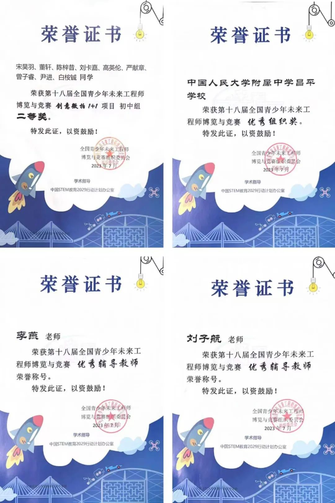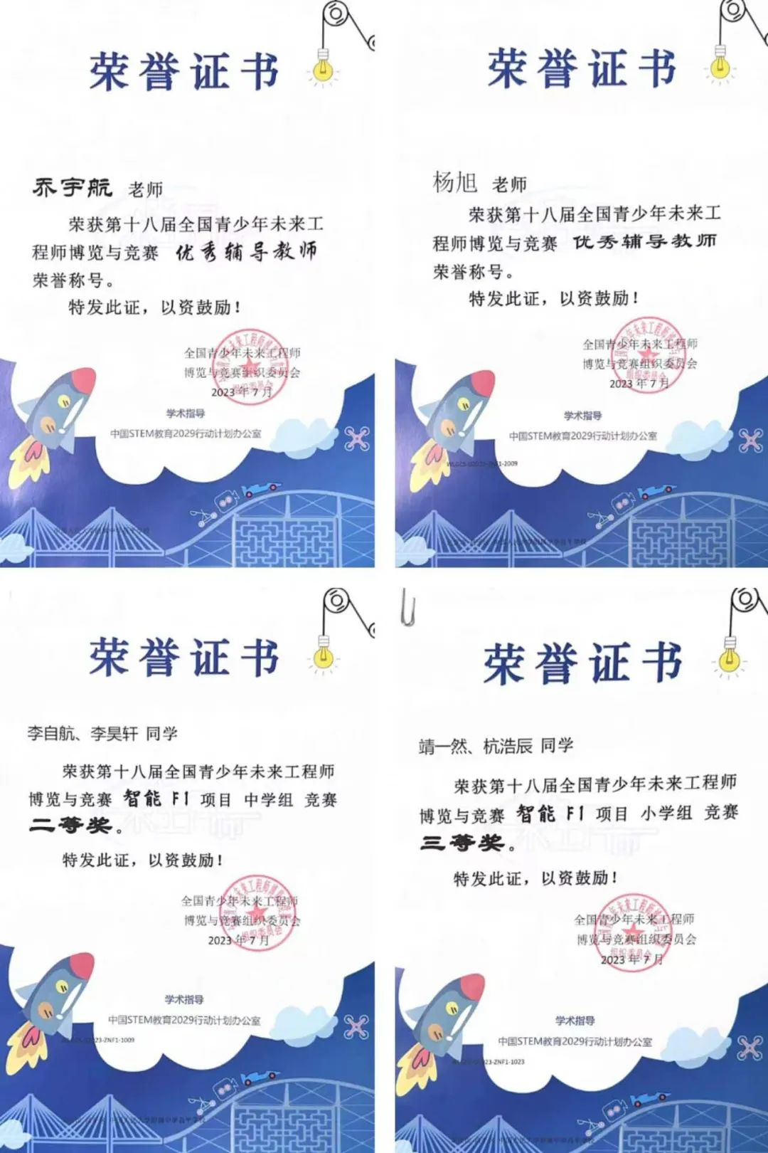 李自航、李昊轩同学参加智能创意F1项目(中学组),获得: