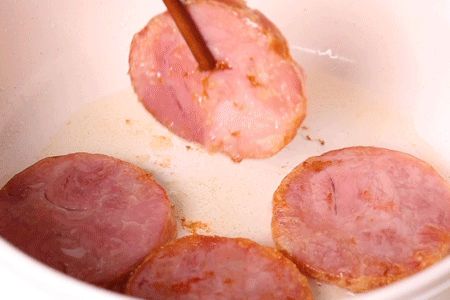 像我平时懒得做饭的时候,就把它切好放在油锅里煎一煎,火腿被煎滋滋冒油!