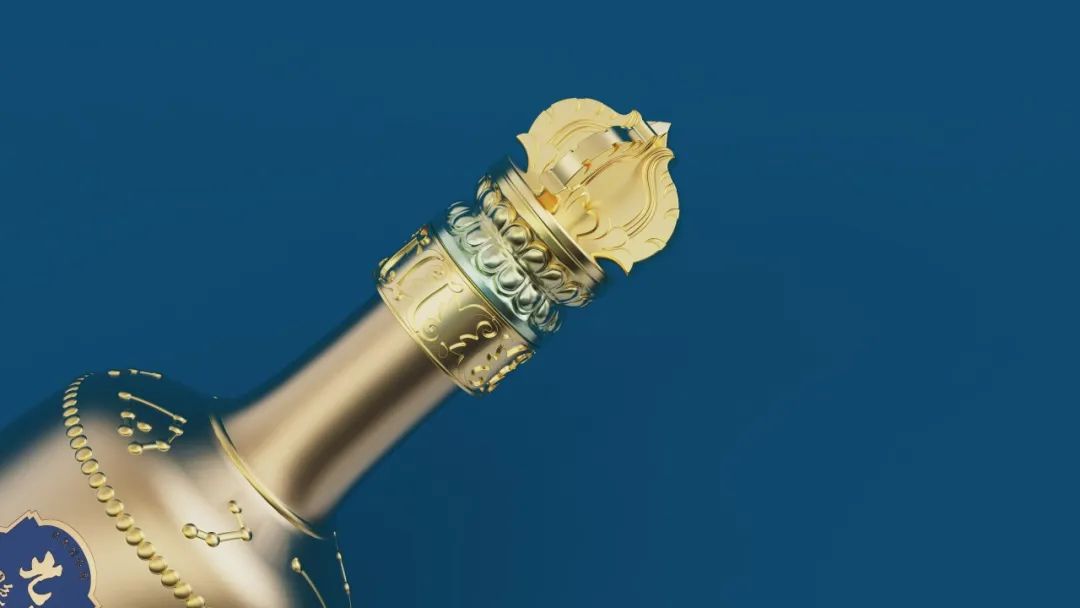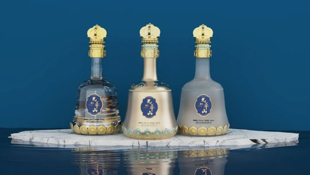 选用佛教法器代表金刚杵置于酒瓶顶部,代表所向无敌、无坚不摧的智慧和真如佛性;采用盘茎莲花藻井基本样式逻辑;采用二十八星宿元素当中的东方七宿置于瓶身天穹位置,周而复始的不停运行照应着大千世界的风气云涌;采用念珠环绕瓶体置于星宿下方,当悟大千世界的变化、悟自己的心性如何;瓶底似一朵莲花托起,让酒瓶焕然新生……5大佛国文化符号的点缀,不仅让九华山酒这一重磅新品蕴含着佛家智慧,更让人眼前一亮,品饮这款白酒,也仿佛在喝莲花瓣上的露水。