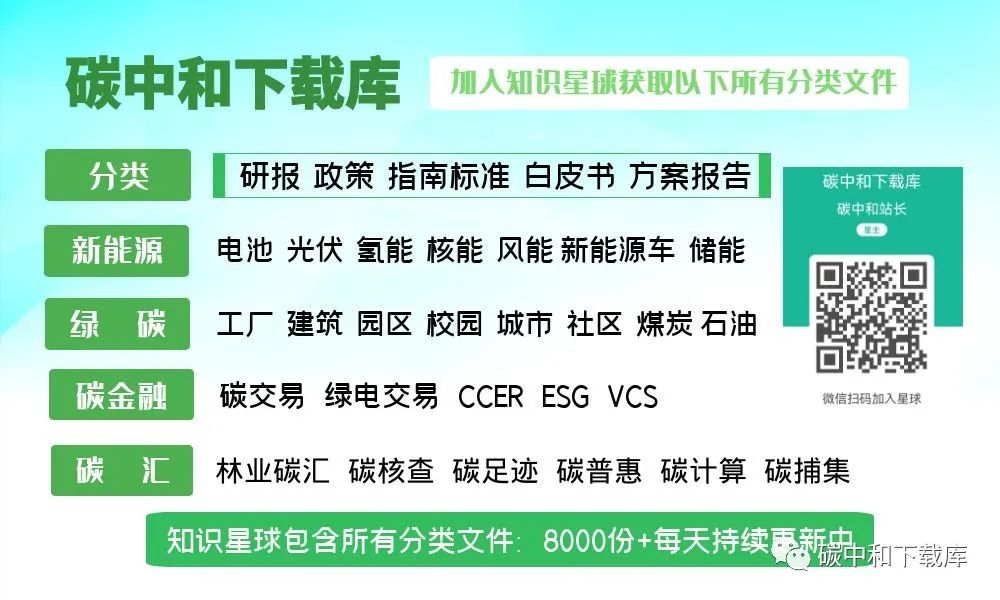 【碳中和下载库】内容包含:30大行业8000份+研究报告、行业方案、指南标准、白皮书、电子书、31省政策汇总等碳中和相关资料。碳中和下载库以石油、煤炭、电池、光伏、氢能、新能源;工厂、园区、建筑、城市、社区;碳交易、CCER、ESG、碳汇、林业碳汇;碳核查、碳足迹、碳捕集等领域点击加入【碳中和下载库】星球免费下载8000+报告(搜索“碳中和下载库”进入)