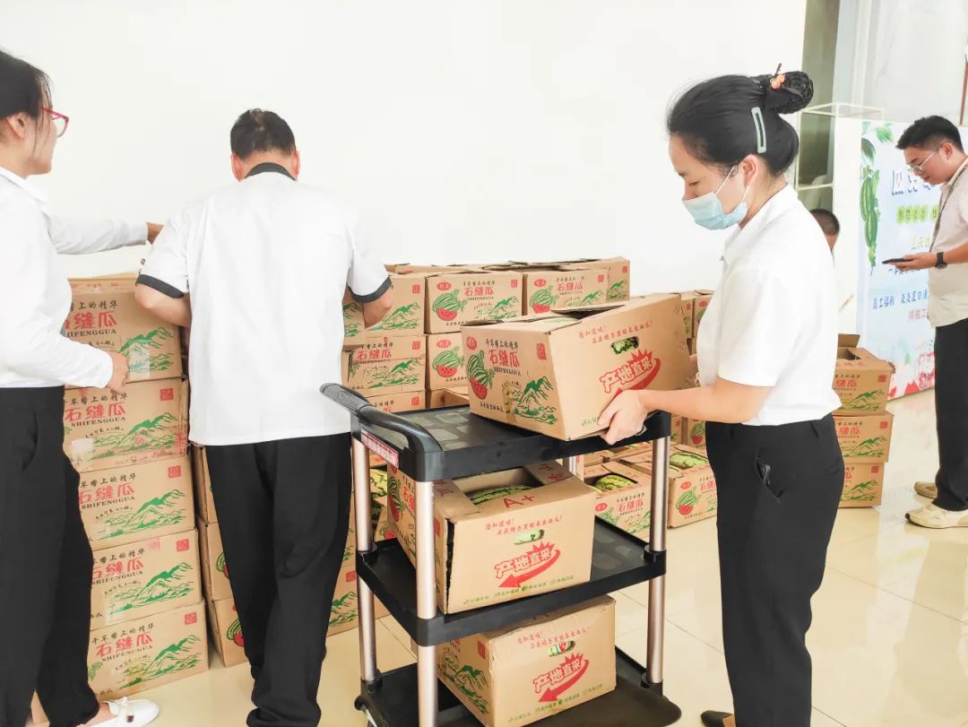 继我会理事单位鸿骏集团购入千斤甘肃苹果后,于8月份鸿骏集团再次采购宁夏地区精品香山石缝西瓜31000斤,在地方餐厅进行统一销售,并且部分西瓜作为企业员工福利发放到总部员工手中,为炎热的夏天消消暑。