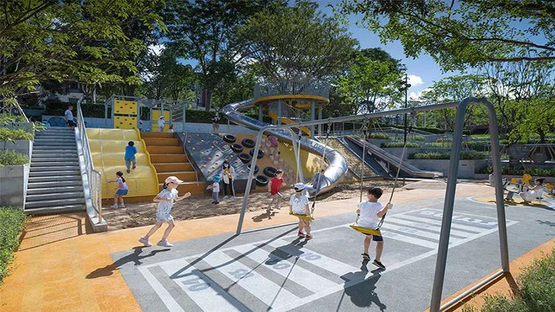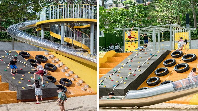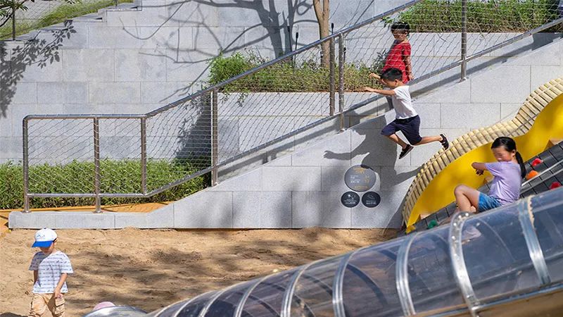 逐层升高的绿植台地是绿色生态攀爬公园游乐场的边界,树荫下的乘坐空间方便家长从多个方向舒适的监护。黄橙色系在稳重灰色的衬托下鲜明欢快,激发孩子们的好奇心,又不造作。