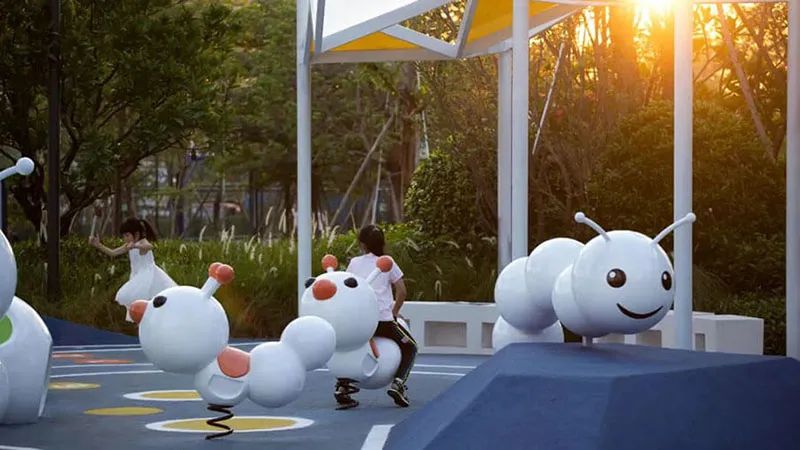 设计将小毛毛虫做成摇摇乐形式,孩子们可以坐在上面玩乐的同时还可以观察毛毛虫的形态特征;将茧设计成一个攀爬设备,孩子们可以体验到攀爬的乐趣;蝴蝶上设计的有爬梯和滑梯,孩子们通过爬梯爬上蝴蝶的身体,蝴蝶色彩斑斓的翅膀可以增加孩子们的视觉感受,让孩子们对蝴蝶的形成有更强的探知欲。