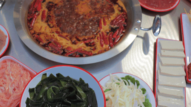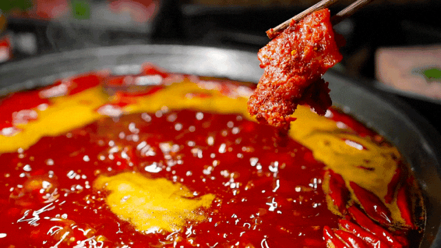 吃火锅怎么能少得了麻辣牛肉?!喜欢吃辣的小伙伴一定要点,用筷子夹起几片一股脑入滚锅里烫,待红色变深就可以捞出开始享用。