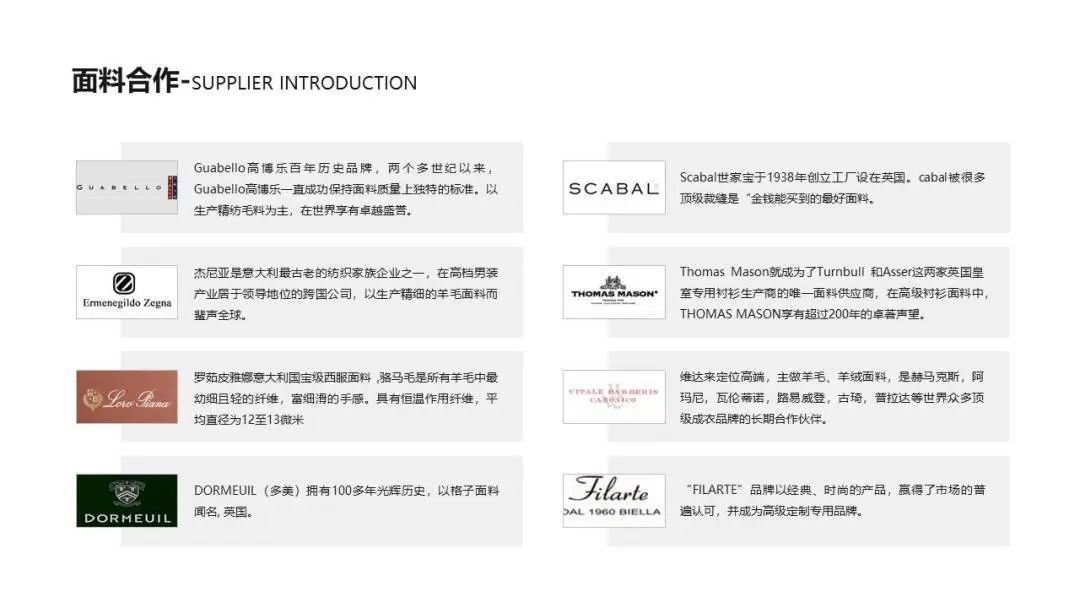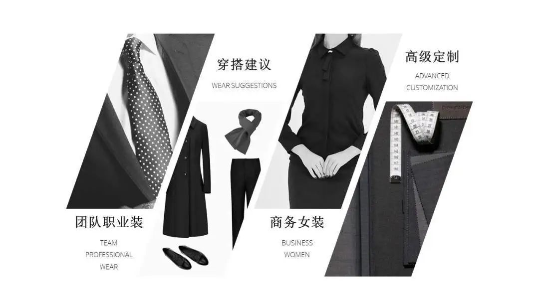 经营范围:私人定制及团体定制,私人定制按照个人体型,量身制作,以精湛的工艺、经典的版型、高档的面料、优质的服务,充分考虑到个人的身材特点采用人体工程学剪裁,更加合身舒适,服务于优雅绅士的高品质需求。各大中小型企业的行政套服、企事业单位厂服,工作服以及各类学校校服,星级宾馆酒店、娱乐中心、休闲中心的职业装。
