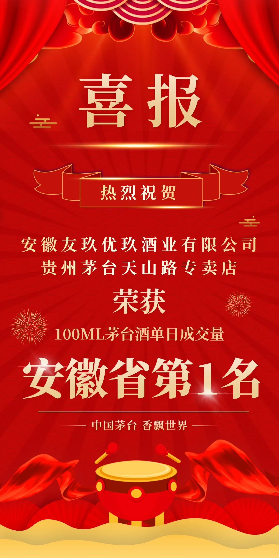 喜报:安徽友玖优玖酒业有限公司荣获100ml茅台酒单日成交量安徽省第1名