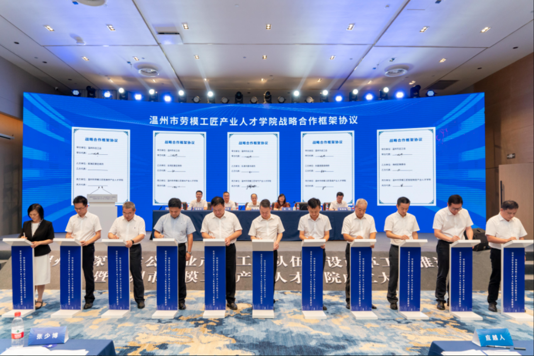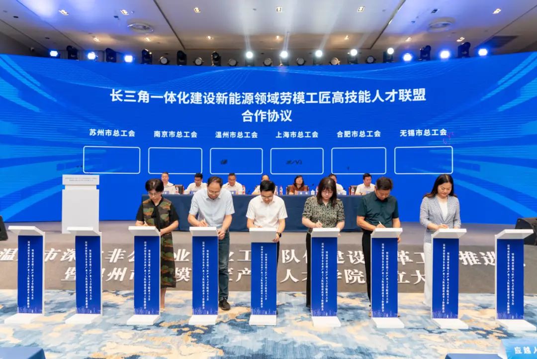 活动现场还进行了温州市劳模工匠产业人才学院建设战略合作框架协议、长三角一体化建设新能源领域劳模工匠高技能人才联盟合作协议、各研究院所发起联盟协议三个签约仪式。