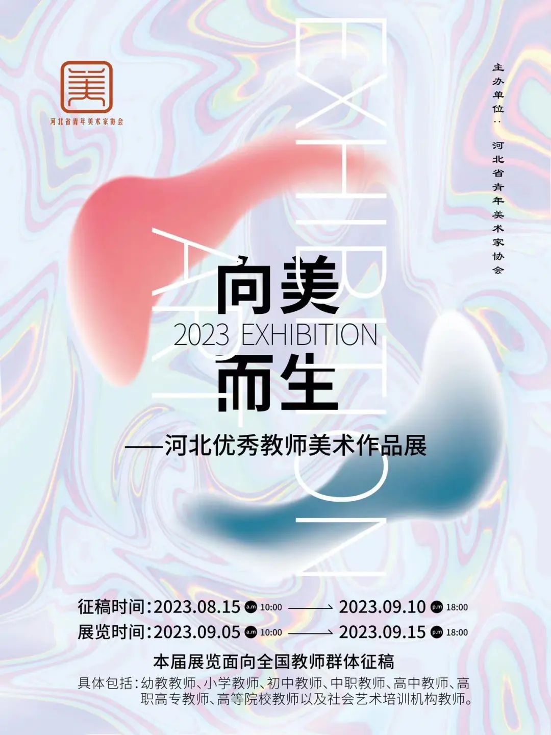 为迎接第39个教师节的到来,营造尊师重教的社会氛围,展示优秀教师的艺术创作成果,打造属于优秀教师的专业展览,河北省青年美术家协会定于2023年9月举办“向美而生”——河北优秀教师美术作品展。通过展览活动,实现以展览促进教学,以展览促进交流,激发调动广大教师美术创作的热情和积极性,提升其专业水平和教学能力。现将有关展览事宜通知如下:
