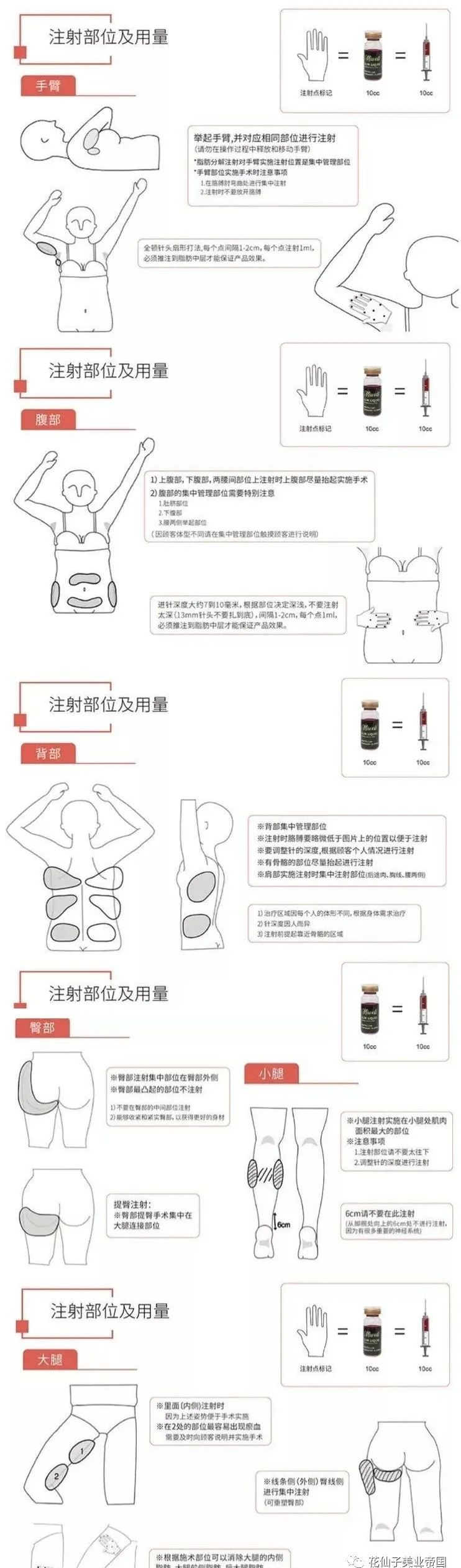一组2瓶,混合震荡均匀后抽出,23G钝针扇形平铺,均匀作用于脂肪层。操作后立刻冰敷,24小时内多次冰敷止血。24小时候热敷+按摩散淤。