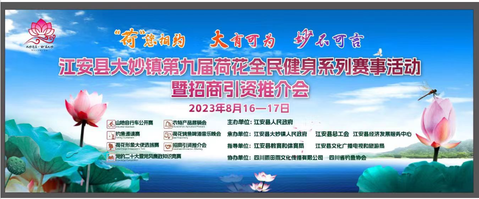 2023年江安县大妙镇第九届荷花全民健身系列赛事活动暨山地自行车公开赛、垂钓邀请赛、荷花形象大使选拔赛、荷花烤鱼啤酒音乐晚会、招商引资推荐会等系列活动将盛大启幕。