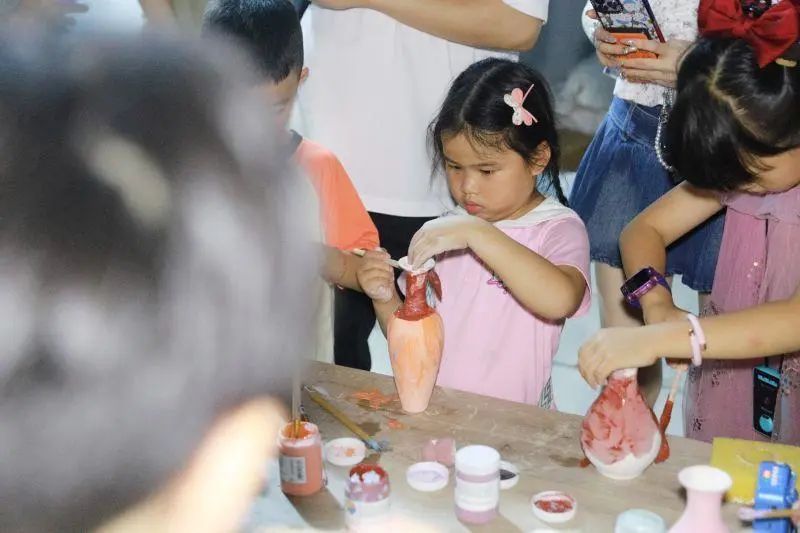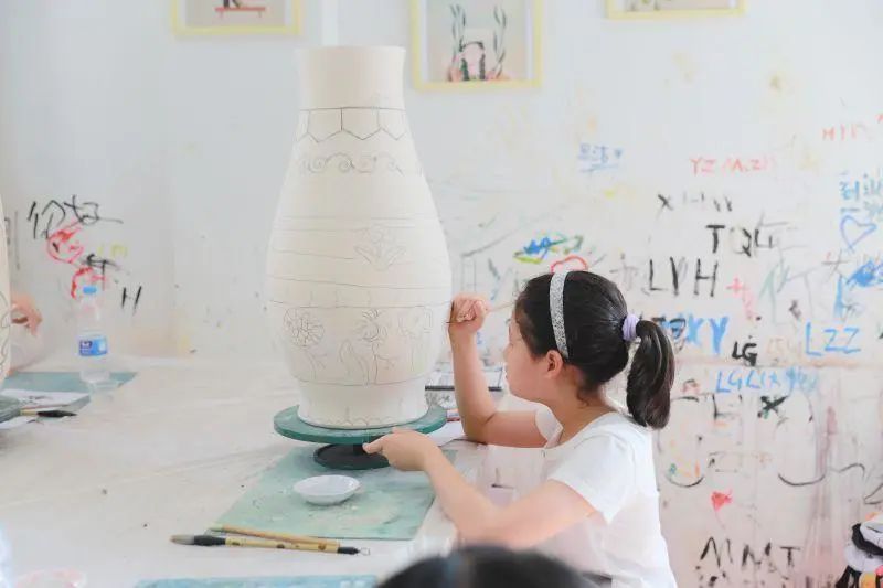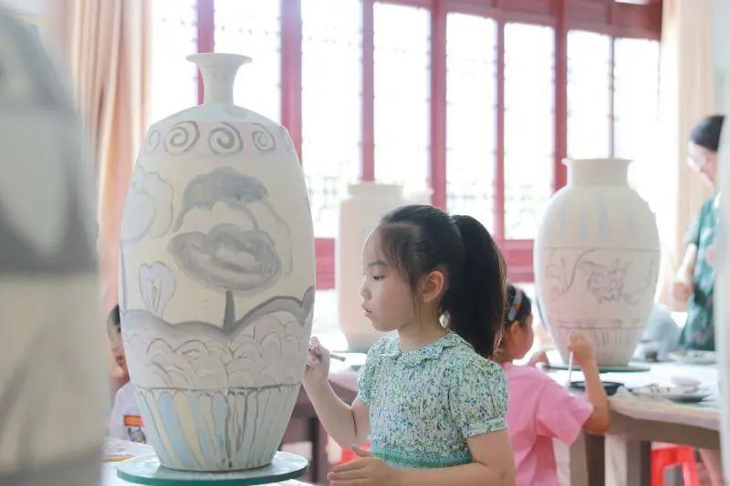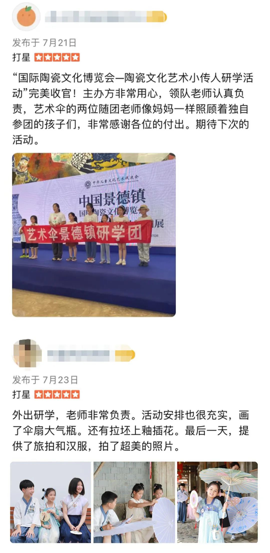 “皇窑”陶艺体验——乐烧+篝火晚会,体验新式的快速烧陶,见证自己的作品涅槃而生,绽放异彩。“皇窑陶瓷艺术博览区”参加“陶瓷文化艺术小传人作品展”开幕仪式,现场授奖接受专家/大量颁发荣誉证书;景德镇国际时尚新地标——“陶溪川”,穿梭于充满瓷都特色的艺术夜市,与来自五湖四海的“景漂艺术家”们进行艺术交流。瑶里古镇,数百幢明清徽派建筑依山傍水、错落有致地分布在瑶河两岸,飞檐翘角,粉墙黛瓦,掩映在青山绿水中。沿河两岸,依稀可辨的古窑址、苍凉厚重的古商道透着古风古韵,引人驻足凝望。五天的研学之旅中,艺术伞的小学员们收获满满,既体验了江南水乡的古文化魅力和传统艺术的精髓,又拓宽了文化视野,增强了创作能力,还收获了陶瓷博物馆的荣誉证书。更是得到学员家长的一致好评。未来,艺术伞将为小学员们带来更为丰富的艺术活动内容,帮助他们在艺术中成就更好的自己。