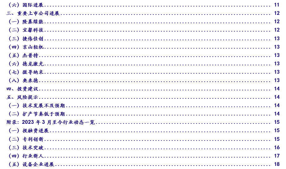 钙钛矿电池及设备玩家持续扩容,央企在华能、三峡等基础上新增中核集团。2022年至今,多家企业进军钙钛矿领域或融资用于研发及新建产线,包括曜能科技、光晶能源、仁烁光能、众能光电等,我们梳理具备产线规划的企业已超18家(不完全统计);设备企业中新增奥来德、合肥欣奕华、微导纳米、科恒股份、利元亨、华工科技等布局钙钛矿领域。6月28日,中国核电审议通过钙钛矿商业级中试线立项议案,进军钙钛矿领域。23年5月以来,国际产业化进展提速,第一光伏、丰田汽车等纷纷布局。