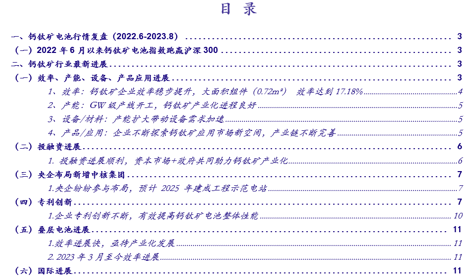 2022年6月以来钙钛矿电池指数跑赢沪深300,复盘2022年6月至2023年钙钛矿行情大致经历4个阶段:阶段一(2022年6月至8月)钙钛矿电池指数涨超60%,标志性事件如纤纳光电全球首批组件出货、宁德时代搭建中试线等;阶段二(2022年8月下旬至12月)钙钛矿指数跟随光伏设备板块回调,主要事件包括极电光能150MW产线投产等;阶段三(2022年末至2023年2月中旬)钙钛矿电池指数跑赢光伏设备13个百分点,主要事件包括纤纳光电组件通过全球首个IEC稳定性全体系认证等;阶段四(2023年2月中旬至今)受个别企业概念炒作等影响,钙钛矿指数持续下探,目前与2023年初持平,标志事件包括极电光能全球首条GW级产线开工等。