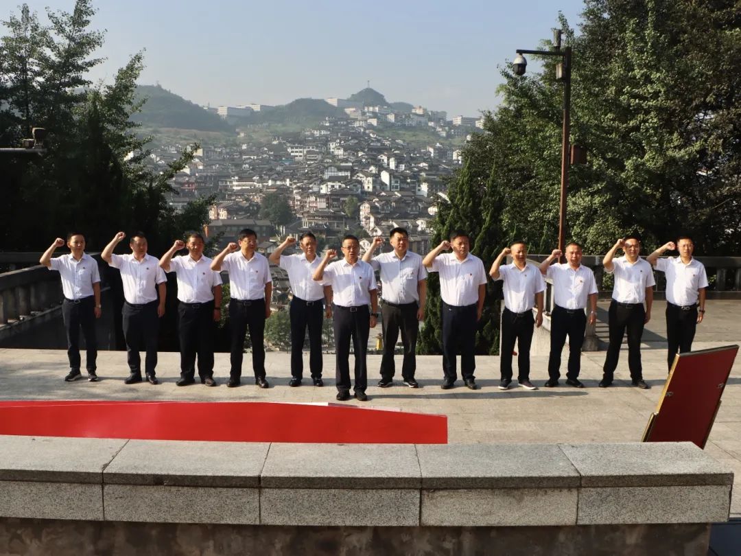 红军四渡赤水纪念园是全国红色旅游重点景区和贵州省爱国主义教育基地,主要由四渡赤水浮雕墙、纪念塔、渡口纪念碑和展览陈列馆组成。在红军四渡赤水纪念塔下,由向平领誓,和义兴党委班子面向党旗重温入党誓词,铿锵有力的宣誓声回荡在纪念塔周围。宣誓结束后,向平一行来到红军长征过茅台陈列馆,一边瞻仰实物,一边聆听讲解,重温红军四渡赤水历程,深刻感悟革命战争年代革命先辈坚持真理、坚定信念、顽强斗争的革命精神和崇高品质。