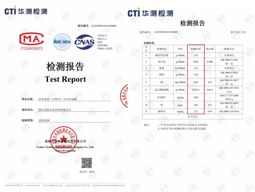 将奶茶信息标注出来,并非是博眼球,而是有权威机构可证明。霸王茶姬将检测报告全文分享,其经过国家认可的第三方检测机构“CTI华测检测”检验确认。