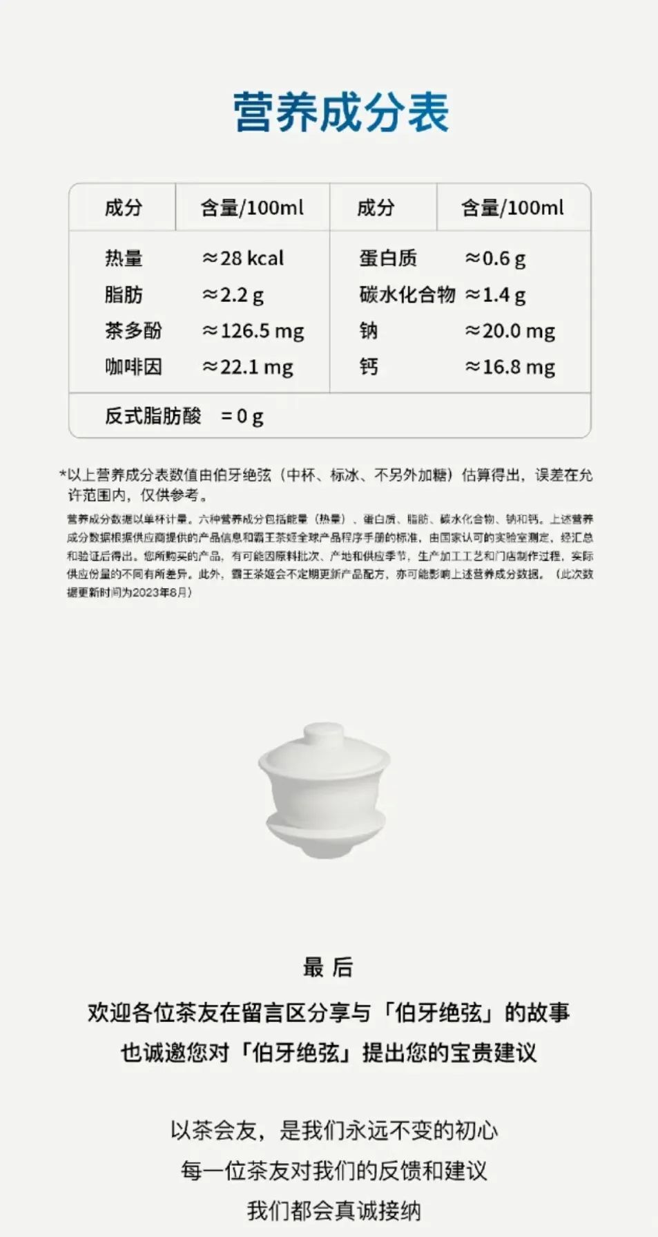 从“一杯伯牙绝弦里面有什么”到“一杯伯牙绝弦有多少热量”,霸王茶姬围绕消费者关心的健康议题,也在不断深挖产品健康升级可能。