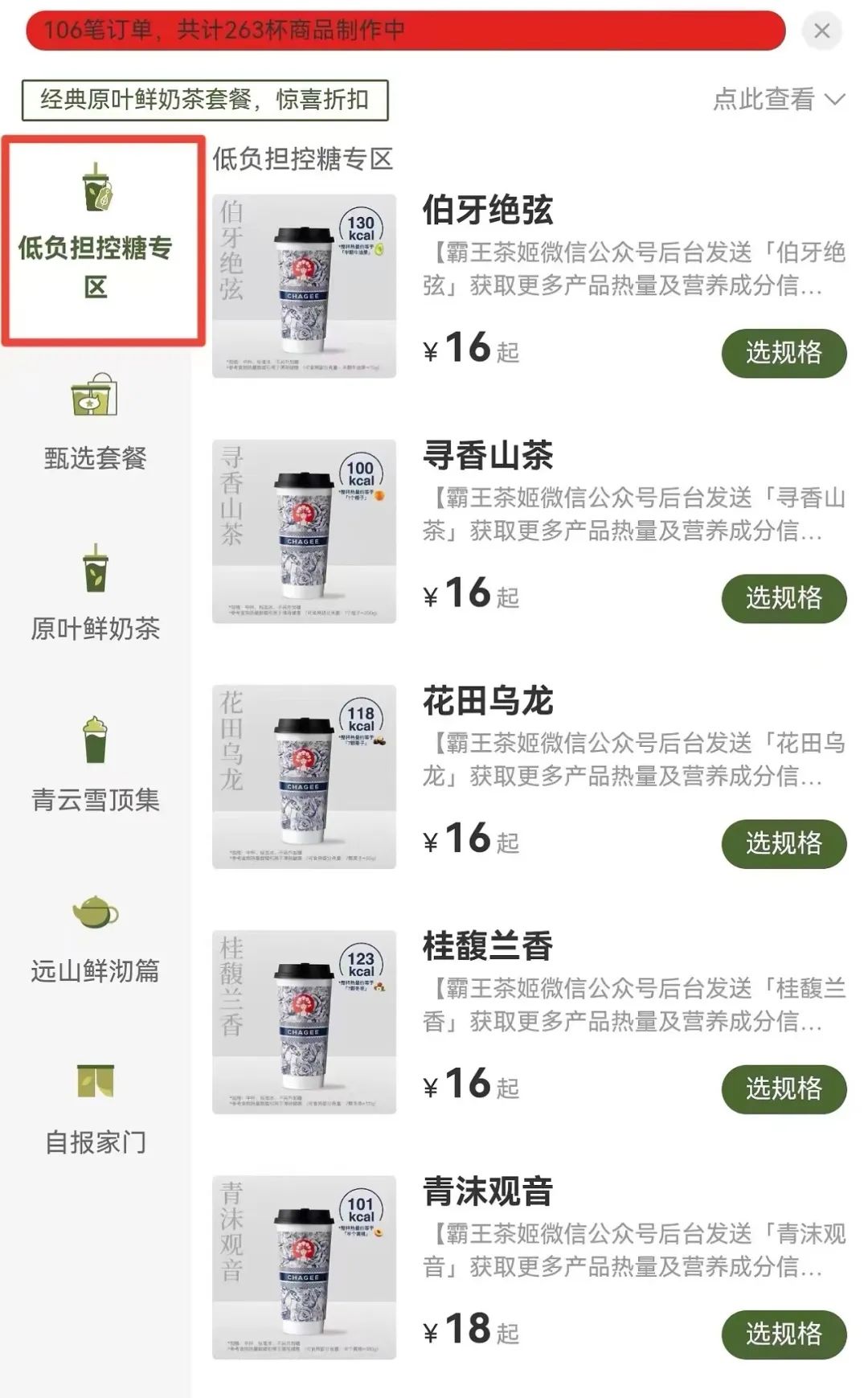 “低负担控糖专区”同时也在霸王茶姬的线下门店、外卖平台上推出。一目了然的热量数值,便于消费者选择更适合自己的产品。