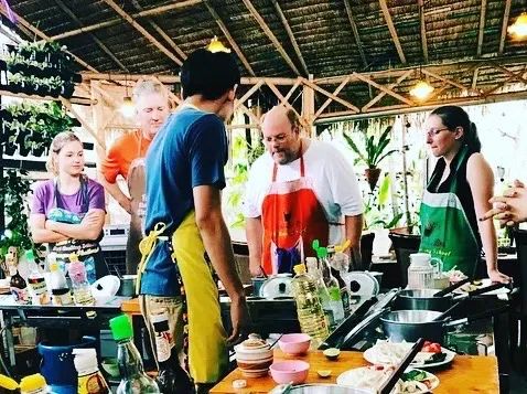 这家泰厨学校最大的特色在于它精心呵护的有机农场,以及难得的中英文双语教学服务。这里食材几乎都是来源自家农场,不仅质量把控有保证,而且环境还特别宽敞舒适。农场里种满了各式水灵灵的蔬果、很多叫不出名字的泰式香料,还有鱼塘、蘑菇屋、小花园,跟着老师参观农场也会让你大开眼界。烹饪老师会带著游览当地的菜市场,挑选食材,讲解神奇独特香料等。泰厨学校教室提供舒适宽敞的烹饪环境,每位学员将有自己专属的厨具,课程中学员将跟随主厨挑选新鲜的食材、分辨不同的辛香料,从菜单上选择想要学习的料理,由主厨亲自示范讲解,从中学习泰国的烹饪文化和技巧。从泰厨的全部流程更好的理解当地的文化。Chom