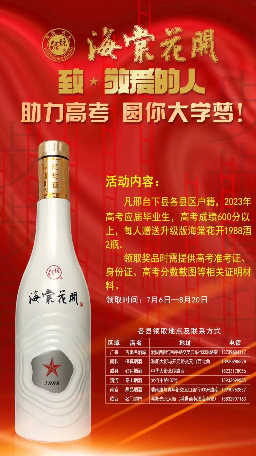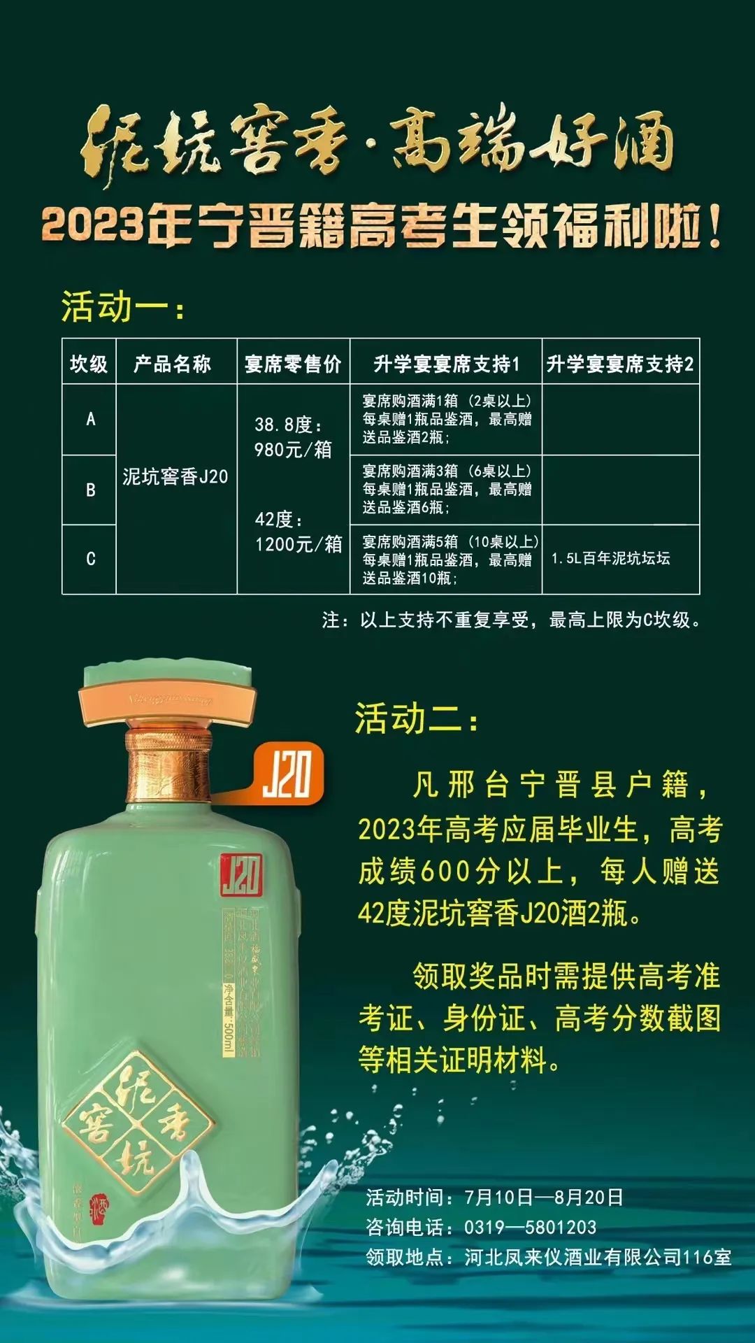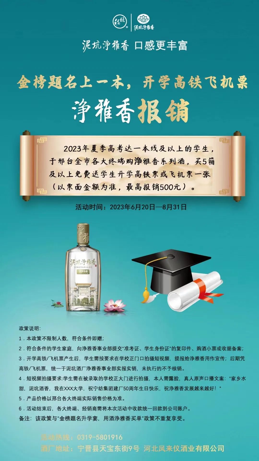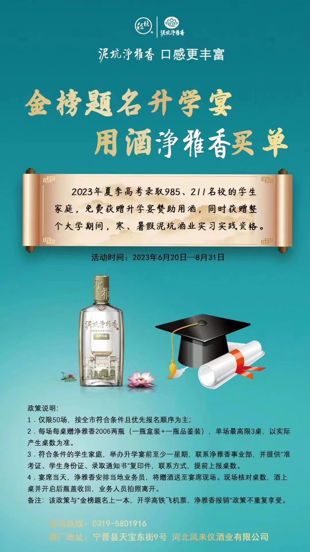 据了解,今年泥坑酒业于6月20日又推出了高考赠酒活动。泥坑酒业在宁晋县区域、邢台市区域、邢台下县区域以及石家庄市区域均为高考学子准备了丰厚的奖励。高考600分以上的高考生,每人获赠2瓶高端泥坑酒。2023年夏季高考达一本线及以上的学生,于邢台全市各大终端购净雅香系列酒,买5箱及以上免费送学生开学高铁票或飞机票一张。高考录取985、211名校的学生家庭,免费获赠升学宴赞助用酒,同时获赠整个大学期间,寒、暑假泥坑酒业实习实践资格。目前,该活动正在火热进行中,将于8月31日结束。