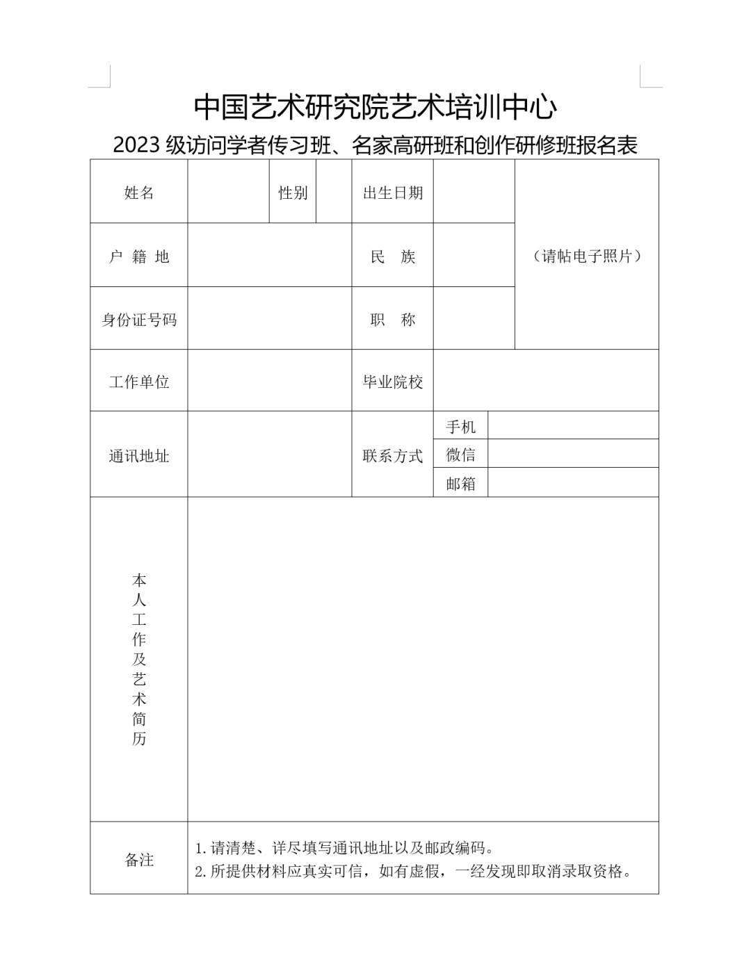 2.报名者须提供电子版材料:①近期创作作品彩色图片3张(每张作品图片大小3-5mb);②个人1寸免冠证件照片;③身份证的正面和背面;④学历证明;⑤填写完整的报名表;以上报名表及报名材料备齐后,请将所有材料打包发送邮箱 zyyyspxzx @126.com(以上文件压缩打包20MB以内)