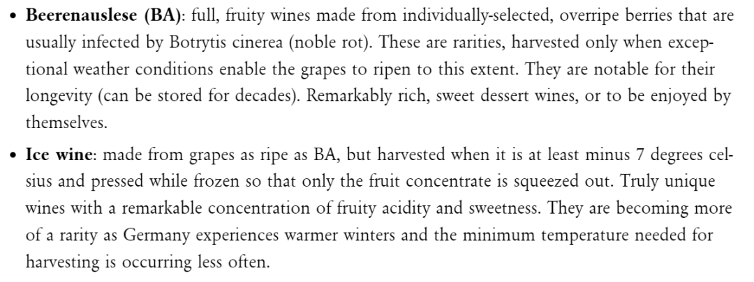 而在WSET三级的课本中,却指出糖分按珍藏酒Kabinett,晚摘酒 Spätlese ,逐串精选酒 Auslese,逐粒精选酒 Beerenauslese,冰酒Eiswein和枯萄精选酒Trockenbeerenauslese从小到大顺序排列。