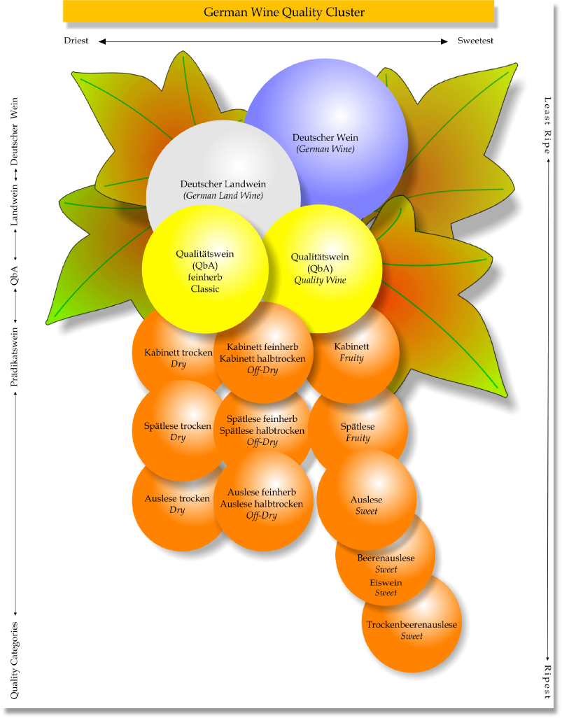 德国葡萄酒复杂的地方在于,在“高级优质葡萄酒 ”(Prädikatswein)中,又分出来6个种类,他们是珍藏酒Kabinett,晚摘酒Spätlese ,逐串精选酒 Auslese, 冰酒Eiswein, 逐粒精选酒 Beerenauslese和枯萄精选酒Trockenbeerenauslese。