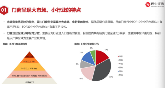 民生证券轻工行业首席分析师徐皓亮在《投资视角下的门窗产业未来》分享中,通过数据对比分析指出,门窗行业当前呈现出典型的大市场、小行业的特点,行业集中度低,TOP10企业市占率不足5%、TOP30企业市占率不足10%。