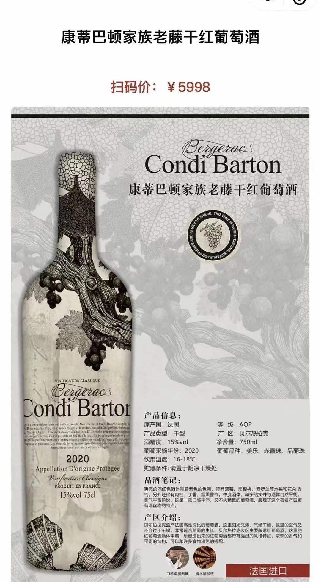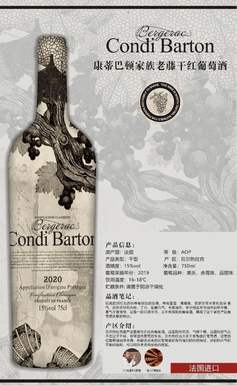 采用30年以上的老藤?葡萄树 纯手工采摘压榨,AOP级别 自法国??贝尔热拉克远道而来 喝酒的朋友都知道 老藤老树才能酿出好酒 ?轻奢珍藏级别,值得收藏