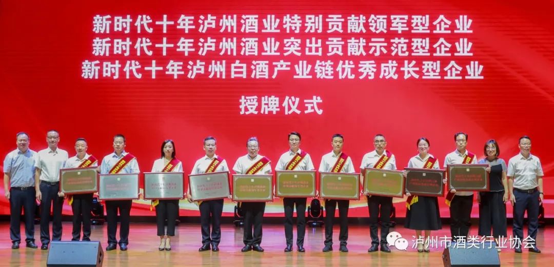 泸州市政府副秘书长范永友宣读泸委〔2023〕28号关于表扬新时代十年泸州酒业特别贡献领军型企业、酒业突出贡献示范性企业和白酒产业链优秀成长型企业的通报,对34家获奖企业授牌,并向获奖代表企业进行颁奖授牌。