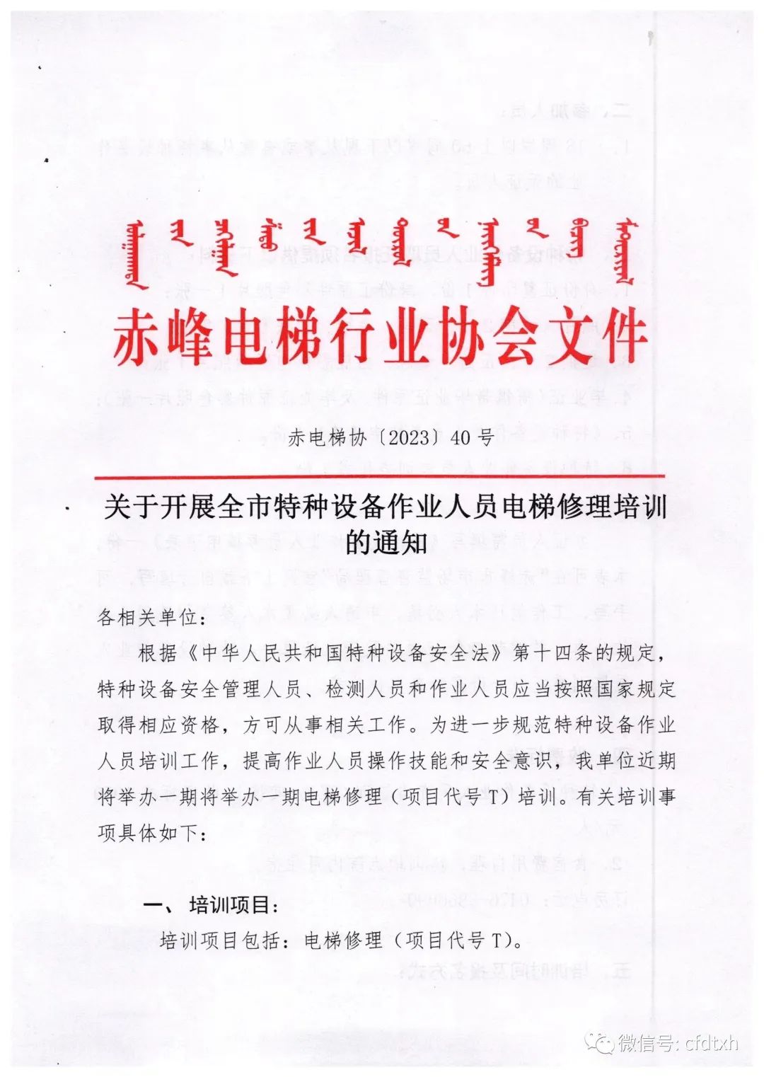 赤峰电梯行业协会关于开展全市特种设备作业人员电梯修理培训的通知