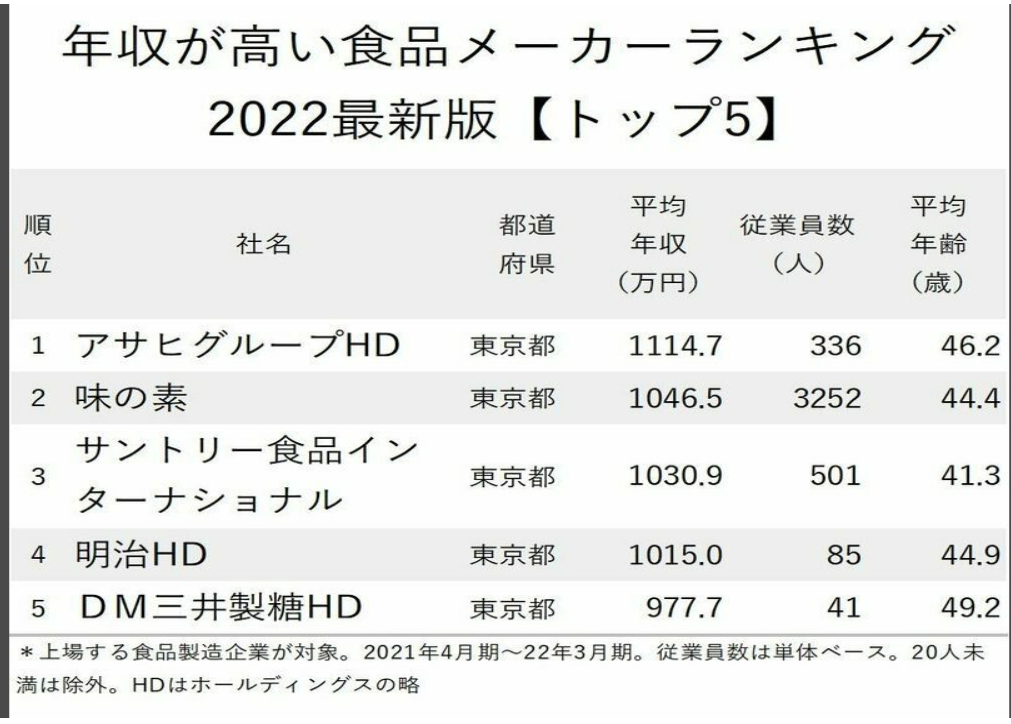 排名第一的是朝日集团的控股公司朝日集团控股公司。平均年收入1114.7万日元,从业人数336人,平均年龄46.2岁。朝日集团生产和销售广泛的产品,包括酒类,饮料和食品,主要是啤酒。不仅仅是朝日啤酒和朝日饮料,Nikukainsky、Enoteka、Calpis等也是朝日集团的企业。其他令人意外的品牌包括薄荷平板的“Mintia”,冻干味噌汤的“Amano Foods”,以及补充剂“Dear-Natura(dianatura)”也是朝日集团食品公司生产和销售的产品。