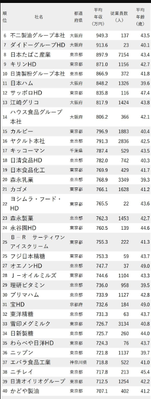 5位はDM三井製糖ホールディングスで、平均年収977.7万円、従業員数は41人、平均年齢49.2歳。DM三井製糖ホールディングスは、2021年4月に製糖最大手の三井製糖(三井物産系)と大日本明治製糖(三菱商事系)が経営統合してできた持ち株会社です。2022年10月1日にDM三井製糖が誕生、国内製糖トップシェアの企業として、白砂糖、黒砂糖、角砂糖、氷砂糖、機能性甘味料などを製造・販売しています。