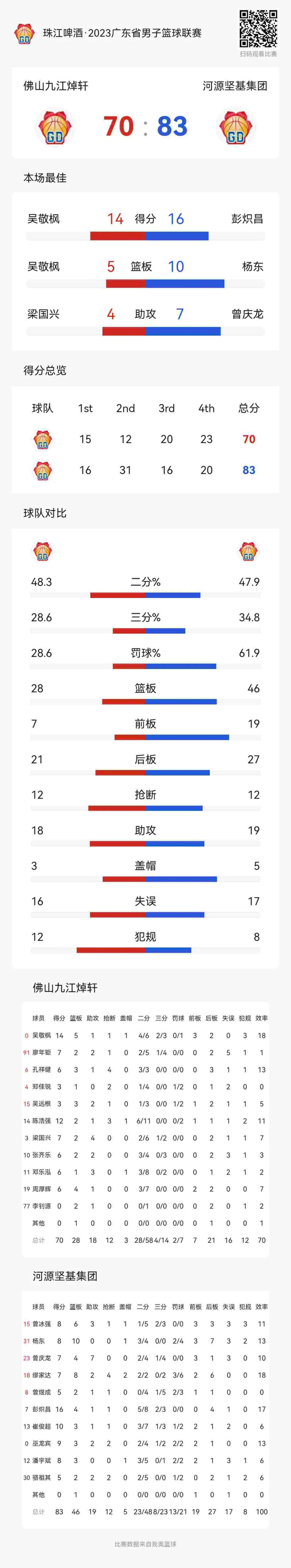 末节,越演越烈,河源坚决执行冲击内线的战术,0号吴敬枫三分入囊,佛山队将比分缩短到13分,双方展开激烈角逐,佛山队河源队各2人得分上双,最终比分83:70,佛山队主场不敌河源队。