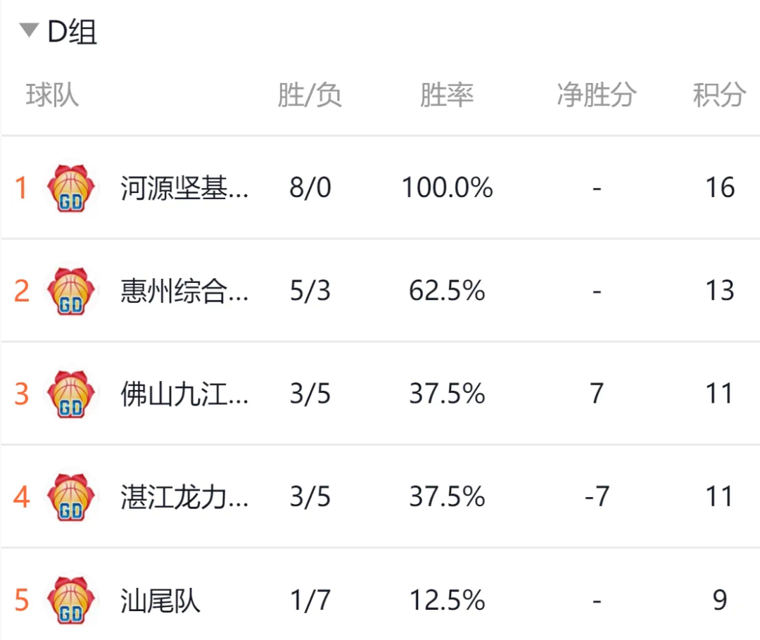 D组波澜不惊,佛山队主场不敌河源,河源队以八战全胜的战绩高居小组第一。湛江以91比79客场战胜汕尾,但此战对小组排名没有影响。惠州队与佛山队分列此组二三名。