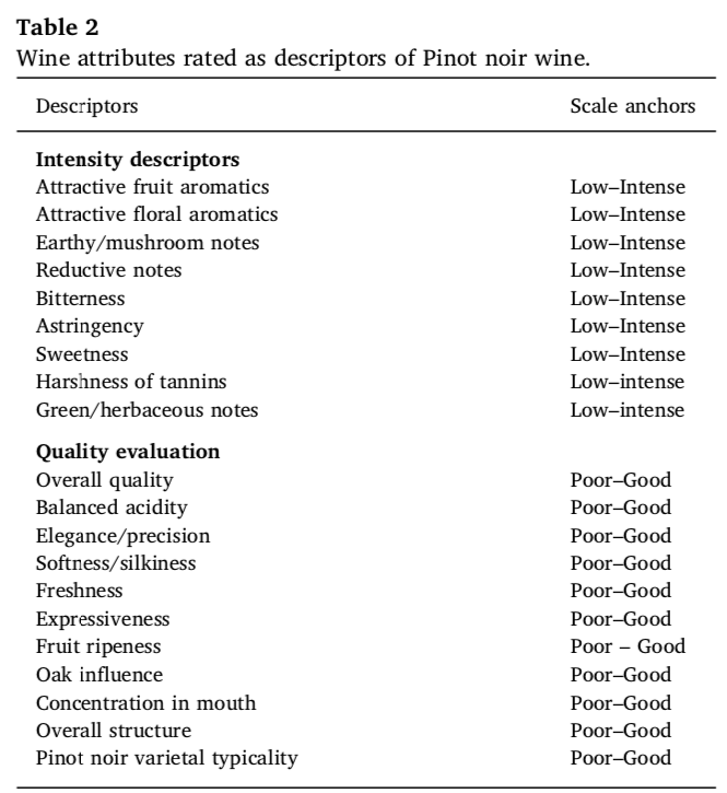 本研究的总体目标是扩展目前对红葡萄酒质量感知的认识。更具体地说,本研究旨在了解葡萄酒专业人士对黑比诺葡萄酒的质量、复杂性和不同典型香气感知的内在化学感官属性,以及这些高阶概念之间的关系。因此,我们研究了:(i) 驱动质量判断的葡萄酒属性;(ii) 驱动复杂性判断的葡萄酒属性;(iii) 复杂性与质量之间的关系;(iv) 感知到的品种典型性对质量和复杂性判断的重要性;(v) 品酒杯颜色对黑比诺化学感官判断的影响。