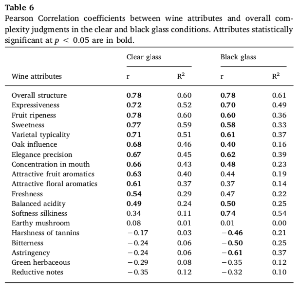 为了突出影响复杂度感知的葡萄酒属性,我们将每种葡萄酒在透明玻璃杯和黑玻璃杯条件下的葡萄酒属性、描述性评分的平均值与复杂度总体评分的平均值相关联(表 6)。在这两种条件下,有几种葡萄酒属性对总体复杂度的判断都有积极的影响,即总体结构、表现力、优雅/精准度、口感集中度、新鲜度和酸度平衡。在其他属性方面,两种条件之间存在一些差异。特别是,在黑杯条件下,复杂性与单宁的刺激性、苦味和涩味呈显著负相关,而在透明杯条件下,则与柔和/丝滑呈正相关。至于诱人的果香和花香、橡木影响、品种典型性、甜味和水果成熟度等属性,透明玻璃杯条件下的相关性要高于黑杯条件下的相关性。最后,就本研究的主要目的而言,上述相关结果表明,品种典型性与感知质量(表 5)的关系比与感知复杂性(表 6)的关系更为密切。