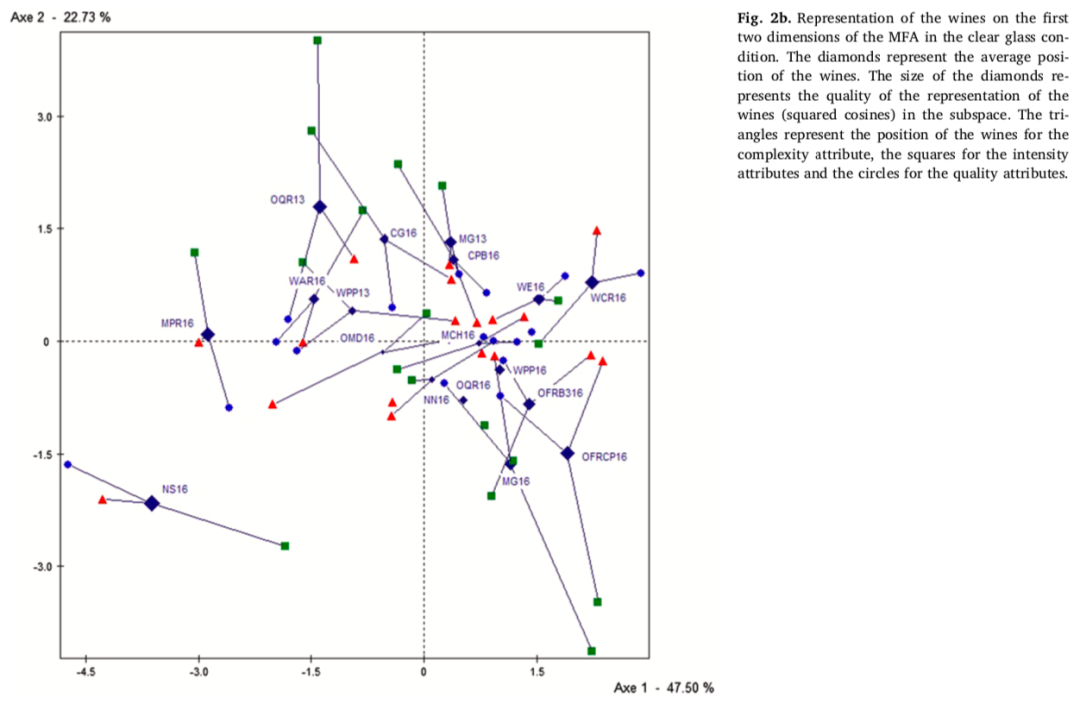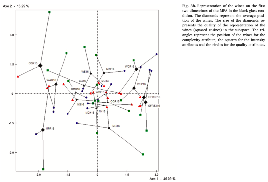 图2和图3分别显示了在透明杯和黑色杯条件下,强度、质量和复杂度属性与葡萄酒在第一个MFA二维空间上的投影。乍一看这两幅图,就会发现这两个条件之间具有很高的相似性(RV = 0.81)。