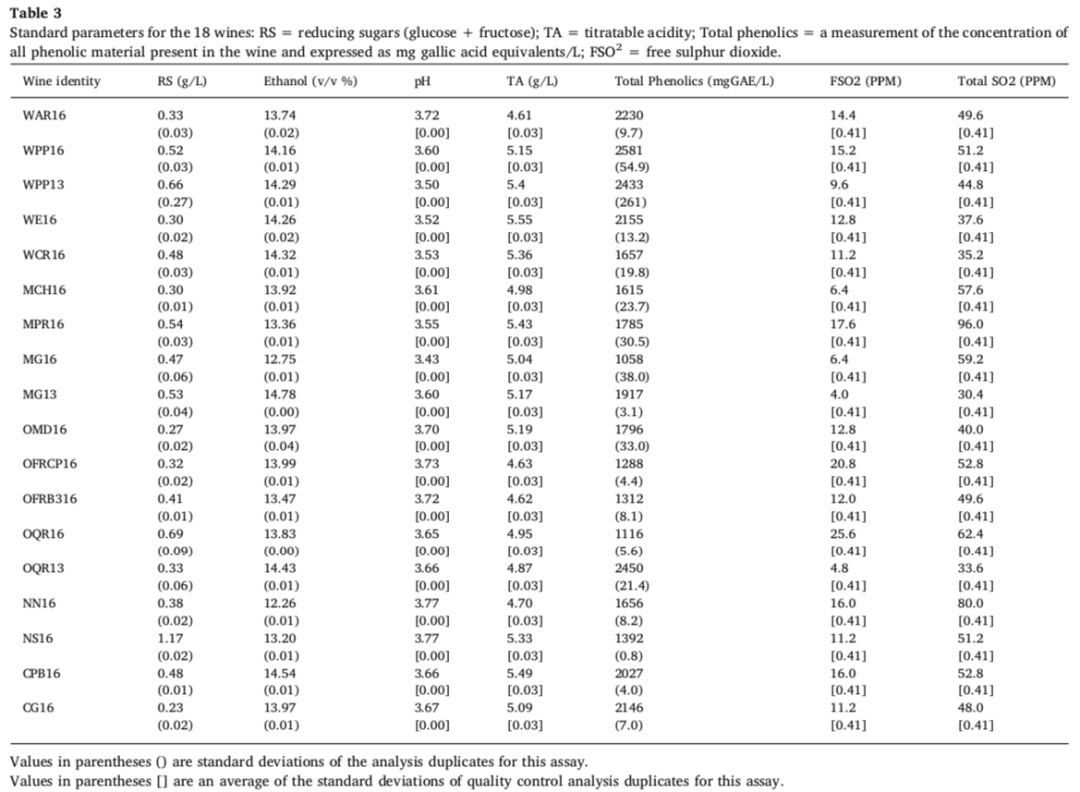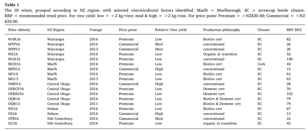 表 1 中的葡萄栽培变量(如葡萄酒产区、葡萄产量)是控制因素,以确保实验中使用的新西兰葡萄酒样本具有代表性。在本研究中,由于合理的原因(如某些单元中的数量较少且不等),这些变量未被视为因变量。