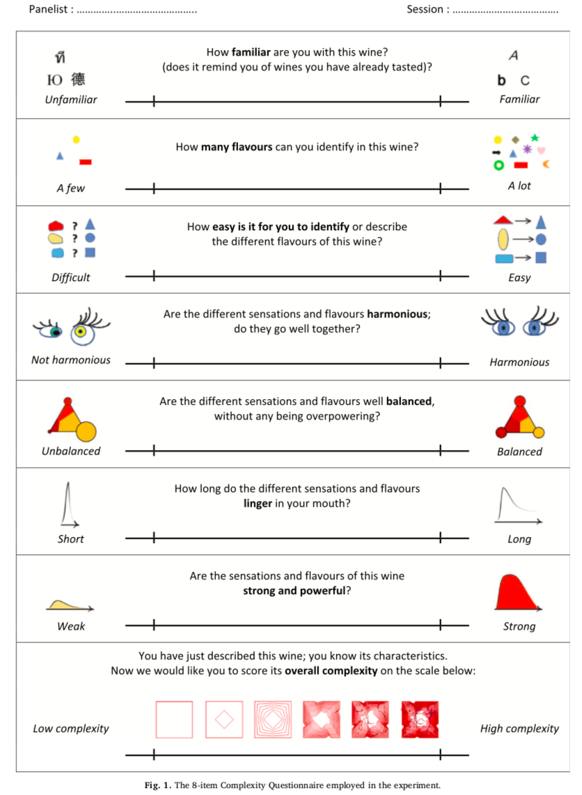 参与者完成对 20 个描述符的评分后,实验人员会收集他们的数据表,并用 8 个项目的复杂性问卷代替。复杂性问卷是用法语编制的随后被翻译成英语使用(见图 1),量表中的图片旨在进一步说明概念。感知葡萄酒复杂性的七个要素包括:葡萄酒的熟悉程度、可感知风味的数量、识别不同风味的难易程度、和谐、平衡、葡萄酒在口中的持续时间(长度)和集中度(风味的强度)。