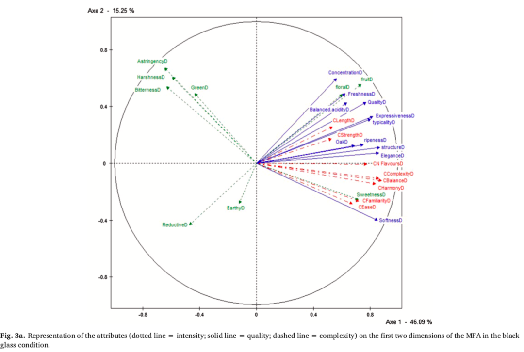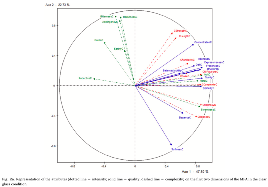 在两种杯色条件下,除了三种属性(诱人的花香、诱人的果香和甜味)之外,复杂性和品质属性似乎在某种程度上独立于其他化学感官属性,而其他化学感官属性大多在第二维度上。这一点在质地属性(如涩味、单宁的刺激性)和苦味方面尤为明显。